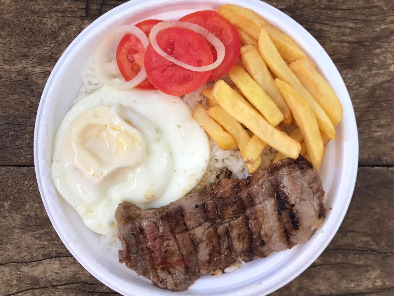 * Bife de Maminha Grelhado* 1 Ovo frito* Fritas* Salada de Tomate* Arroz e Feijão