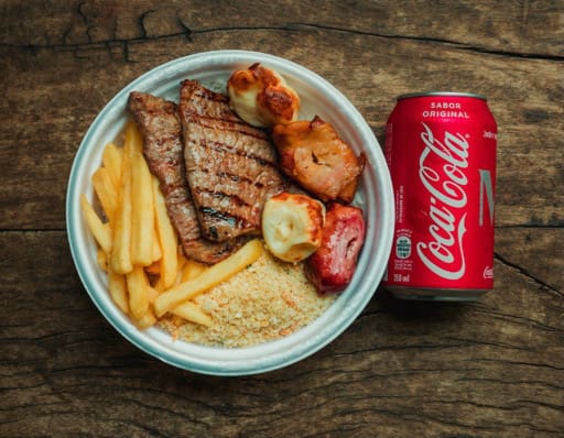 * arroz* feijão* carnes de churrasco - (escolha 3 tipos: linguiça, medalhão de frango, frango em cubos na brasa, tender, coração, filé bovino, lombo, cupim, bife de maminha, * queijo coalho ou queijo mussarela (2 unidades)* batata frita* farofa