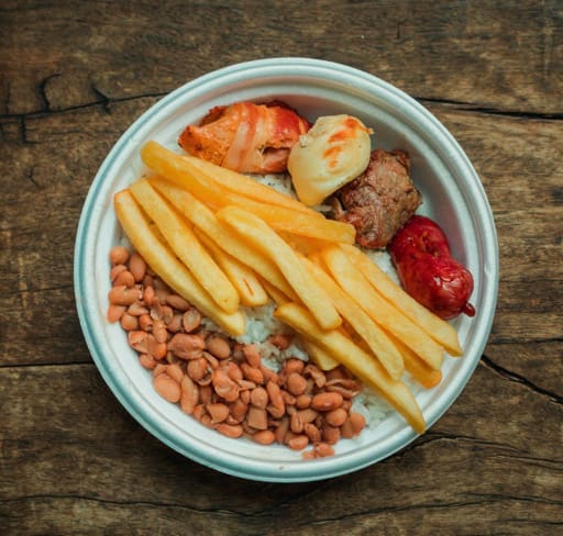 * Arroz* Feijão* Farofa* Tomate com vinagrete* 1 Pastel de Carne* Escolha 3 tipos de carne: linguiça, frango em cubos na brasa, medalhão de frango, coração, tender, lombo suíno.