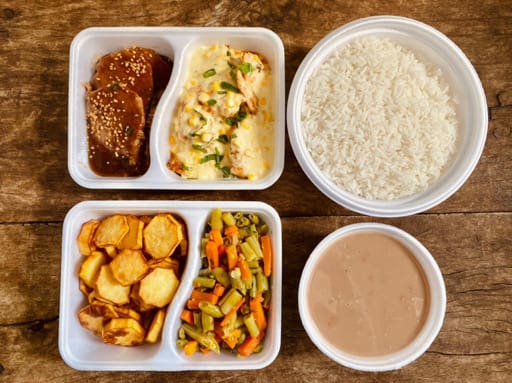Todos os grupos alimentares em uma refeição!* Arroz Branco (700 gramas)* Feijão Carioca (500 gramas)* Legume Refogado + Fritura do Dia Ou Salada do Dia* Carnes (2 tipos de carne do cardápio do Dia (700 gramas)