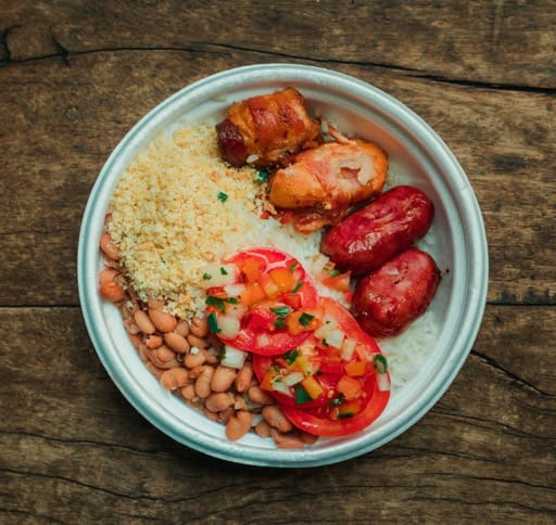 * Arroz* Feijão* Farofa* Tomate com vinagrete* 1 Pastel de Carne* Escolha 3 tipos de carne: linguiça, frango em cubos na brasa, medalhão de frango, coração, tender, lombo suíno.