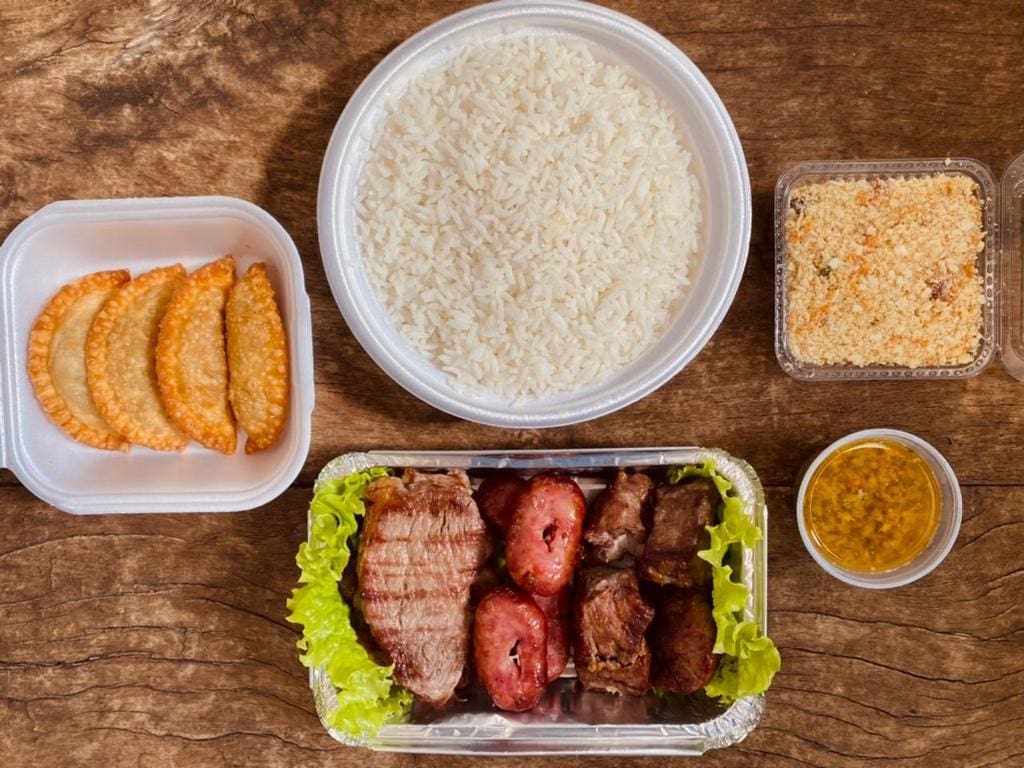 * Arroz Branco (300 gramas)* Carnes de Churrasco (400 gramas) escolha 3 tipos: linguiça, medalhão de frango, frango em cubos na brasa, filé com Catupiry e alho, filé bovino, tender, cupim, bife de maminha, pescada na brasa, queijinho)* Pastel de Carne (4 unidades)* Molho Chimichurri (90 gramas)* Farofa (80 gramas)