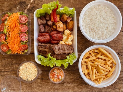 * Batata Frita (300 gramas)* Mix de folhas com cenoura ralada (200 gramas)* Arroz Branco ( 700 gramas)* Farofa (80 gramas)* Vinagrete (140 gramas)* Carnes de Churrasco escolha 6 tipos (700 gramas) Escolha: linguiça, medalhão de frango, frango em cubos na brasa, pescada na brasa, filécom Catupiry, filé com Catupiry e alho, filé bovino, tender, coração, lombo, cupim, bife de maminha, queijo coalho, queijo muçarela.