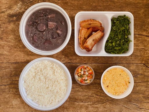 * Arroz Branco (500 gramas)* Feijoada (650 gramas) * Couve (120 gramas)* Farofa (100 gramas)* Vinagrete (140 gramas) * Torresmo
